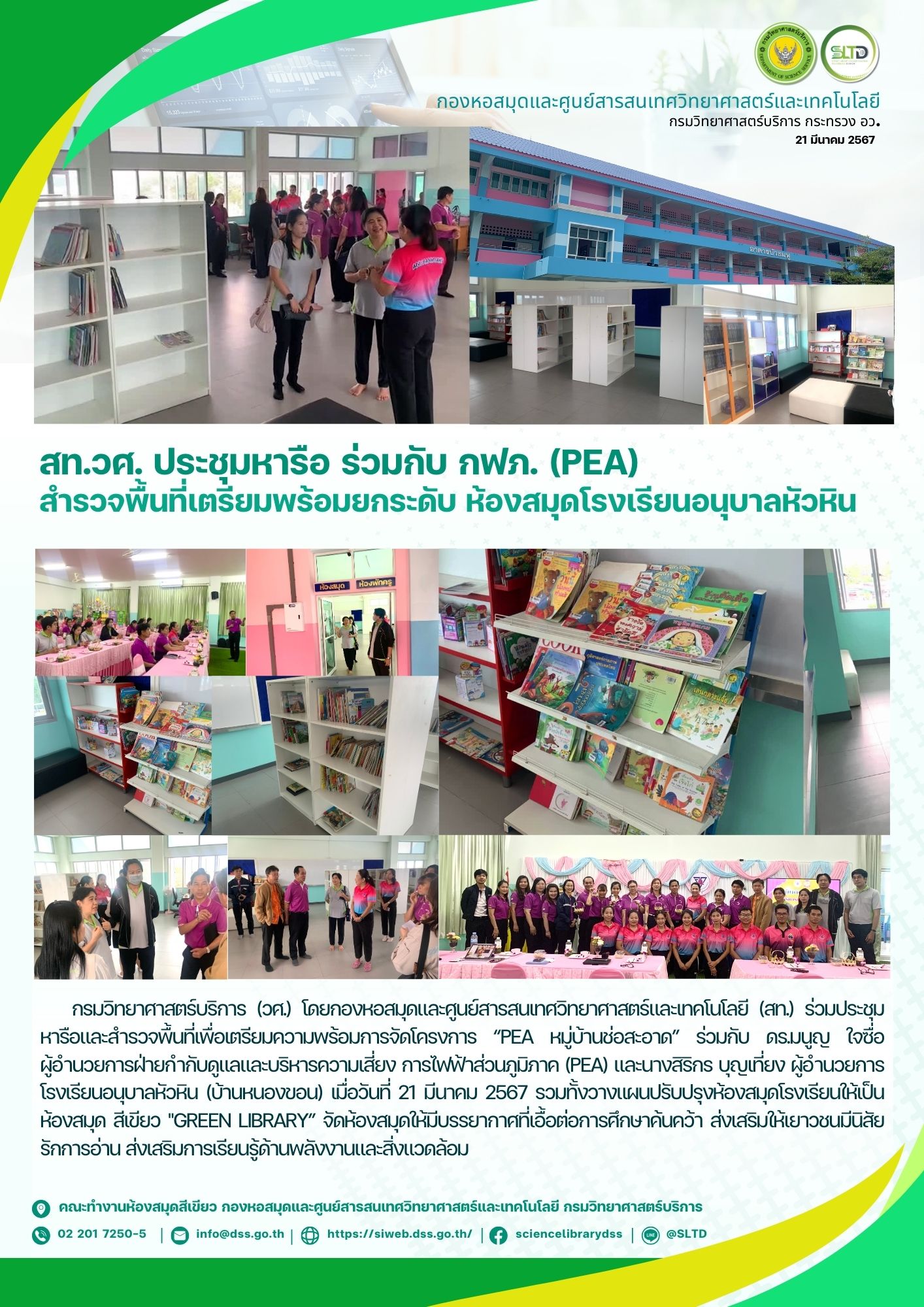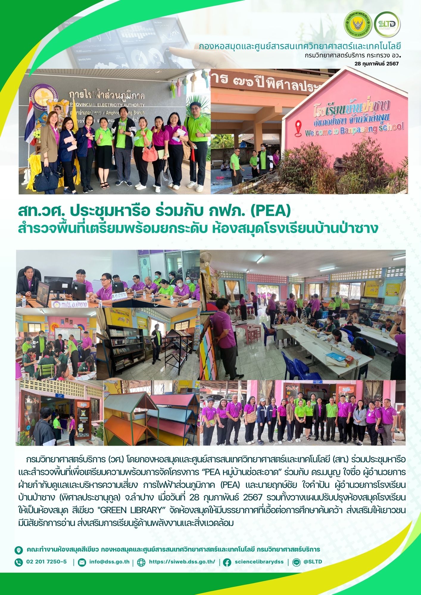 กรมวิทยาศาสตร์บริการ (วศ.) โดยกองหอสมุดและศูนย์สารสนเทศวิทยาศาสตร์และเทคโนโลยี (สท.) ร่วมประชุมหารือและสำรวจพื้นที่เพื่อเตรียมความพร้อมการจัดโครงการ “PEA หมู่บ้านช่อสะอาด” ร่วมกับ ดร.มนูญ ใจซื่อ ผู้อำนวยการฝ่ายกำกับดูแลและบริหารความเสี่ยง การไฟฟ้าส่วนภูมิภาค (PEA) และนางสิริกร บุญเที... Read more