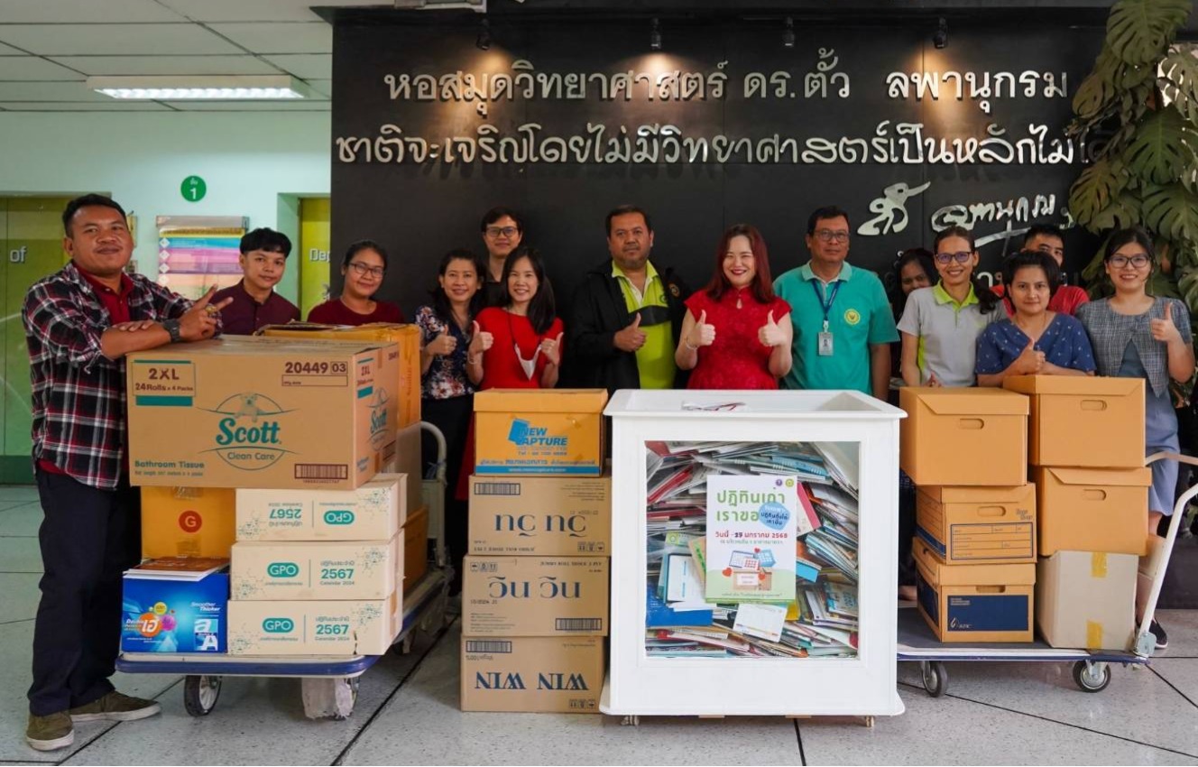 วันที่ 20 กันยายน 2566 นางสาวปัทมา นพรัตน์ ผู้อำนวยการกองหอสมุดและศูนย์สารสนเทศวิทยาศาสตร์และเทคโนโลยี พร้อมด้วยคณะทำงานพัฒนาห้องสมุดสีเขียว และเจ้าหน้าที่ สท. ร่วมส่งมอบขวดพลาสติกชนิดใส (PET) จำนวน 2,700 ขวด ให้แก่เจ้าหน้าที่จิตอาสาจากวัดจากแดง อ.พระประแดง จ.สมุทรปราการ ซึ่งเดินทา... Read more