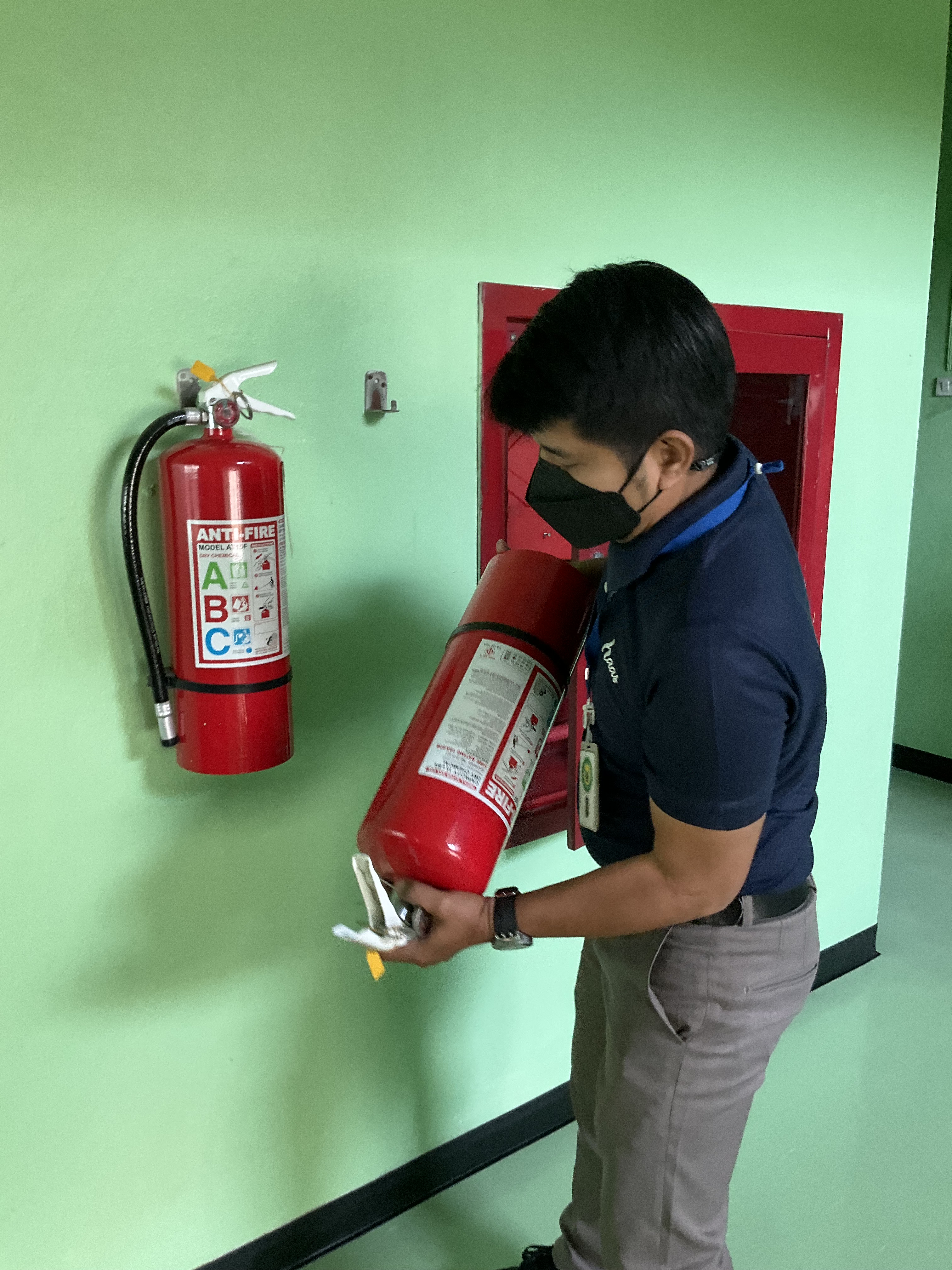 - ถังดับเพลิงมีเพียงพอต่อการใช้งาน (กำหนดระยะห่าง อย่างน้อย 20 เมตร/ถัง ตามกฎหมาย ติดตั้งสูงจากพื้นไม่เกิน 150 เซนติเมตรนับจากคันบีบ และถ้าเป็นวางกับพื้นจะต้องมีฐานรองรับ) พร้อมกับติดป้ายแสดง